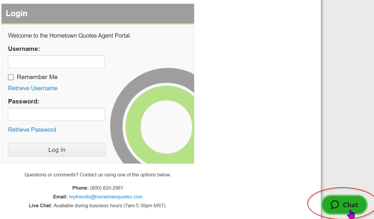 You can easily reach us through our Hometown Quotes website, the Quote Engine login page, or directly within your account. Look for the small chat box in the bottom right corner to connect with our customer service and sales departments. It's the quickest and most convenient way to get all the answers you need!
